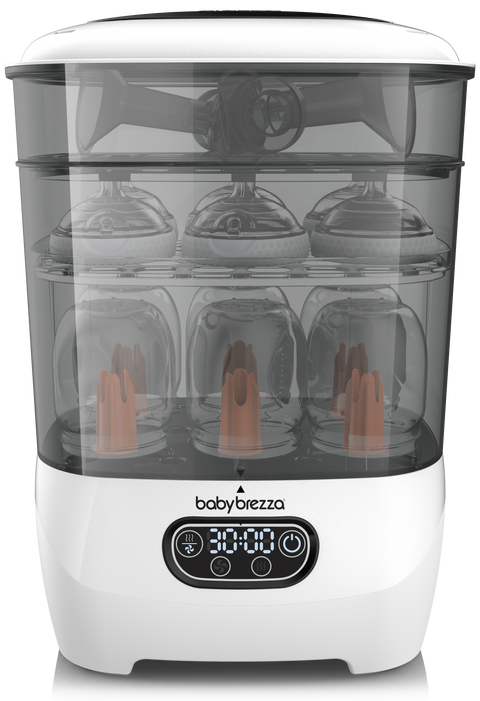The Baby Brezza sterilizer boils water to produce steam (212°F / 100°C) to naturally sterilize your baby products.